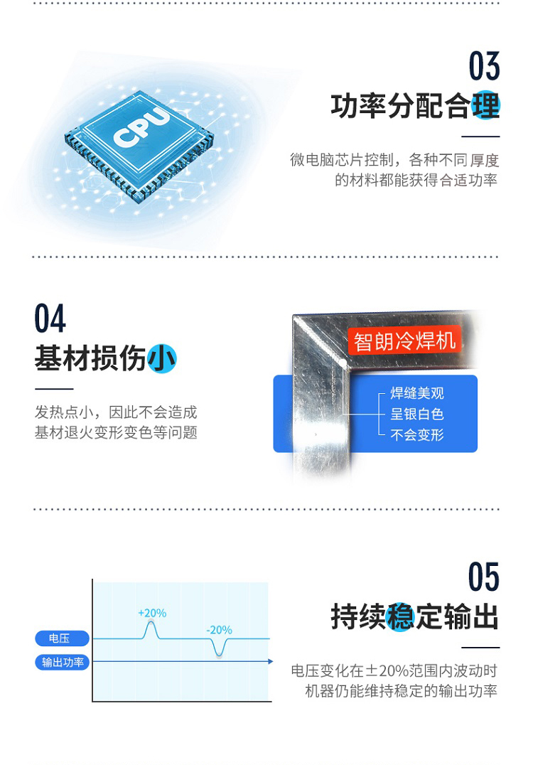 该设备体积小、功率大、效率高,针对传统行业对焊工的高要求水准,该焊机对无操作经验者均可快速上手,焊点呈现银白色,后期无需打磨抛光